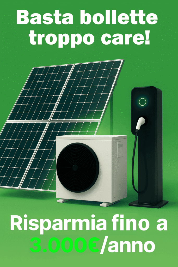 Impianto fotovoltaico (con batteria di accumulo), pompa di calore e colonnina di ricarica auto.